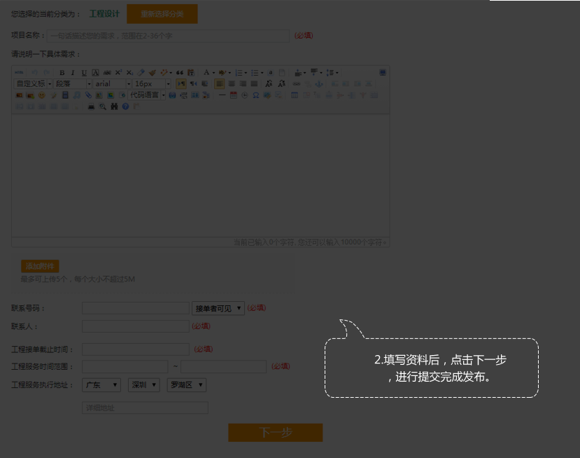 選擇項(xiàng)目類型,填寫項(xiàng)目信息、聯(lián)系方式等提交完成工程項(xiàng)目發(fā)布。