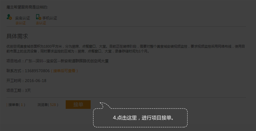 接單,進(jìn)入工程項(xiàng)目詳細(xì)頁,底部接單按鈕進(jìn)行接單。