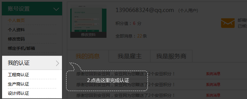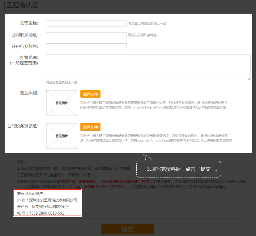 進入工程商認證/生產商認證/設計師認證,填寫提交資料進行認證。
